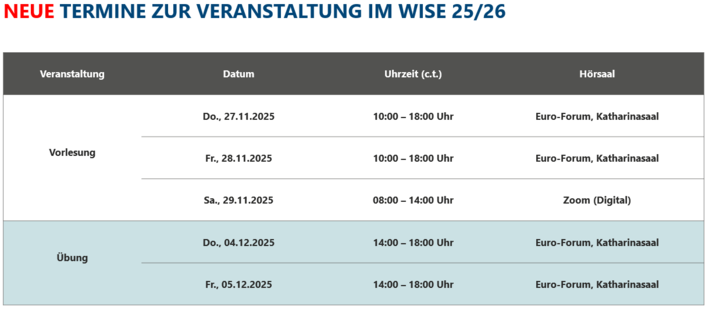 Zur Veranstaltung gehören auch entsprechende Übungseinheiten, in denen die Studierenden auf die Klausur vorbereitet werden.